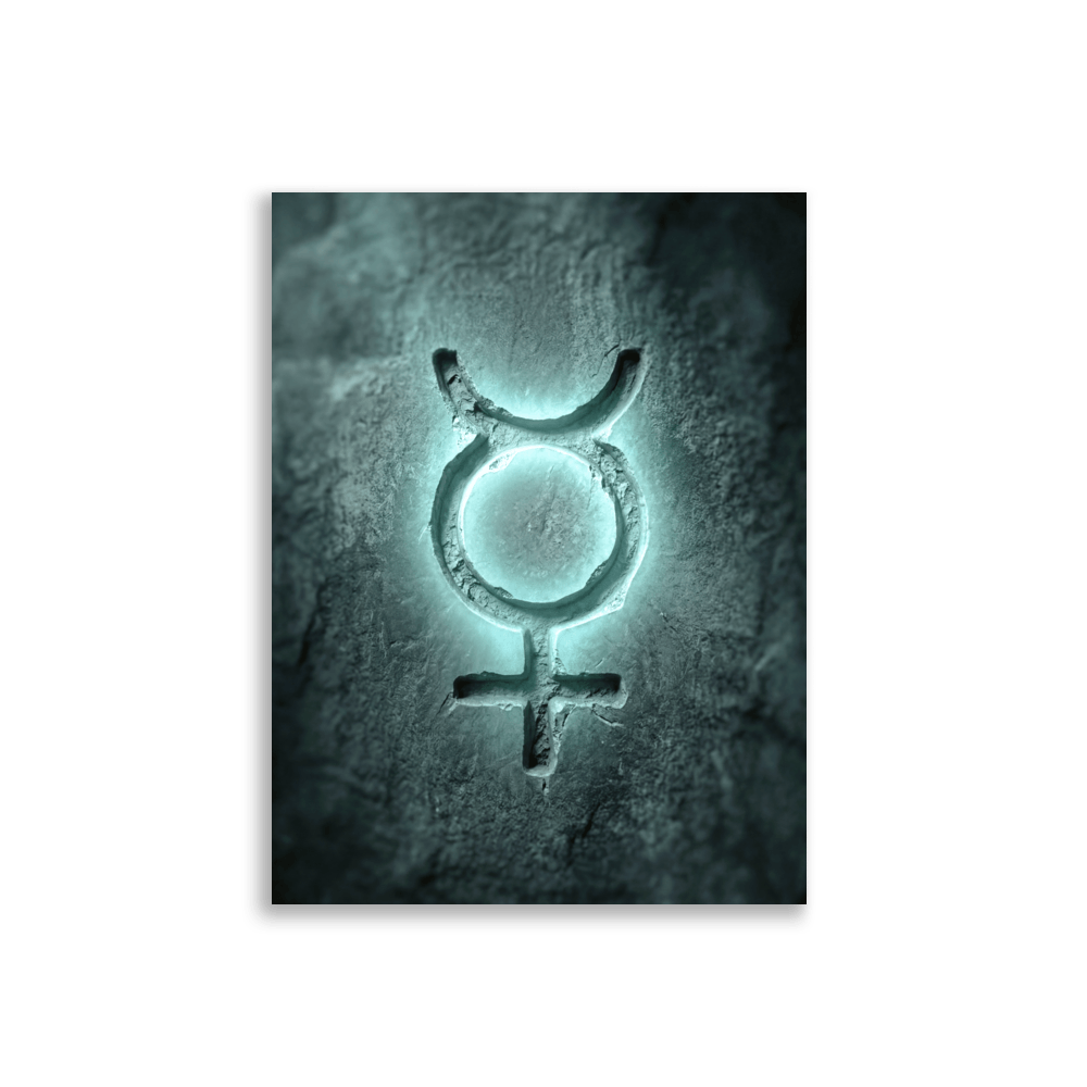 A ritual poster from thedawn depicting the Mercury symbol. Minimal occult design marking the threshold between waking and hidden knowledge in Chapter VIII.