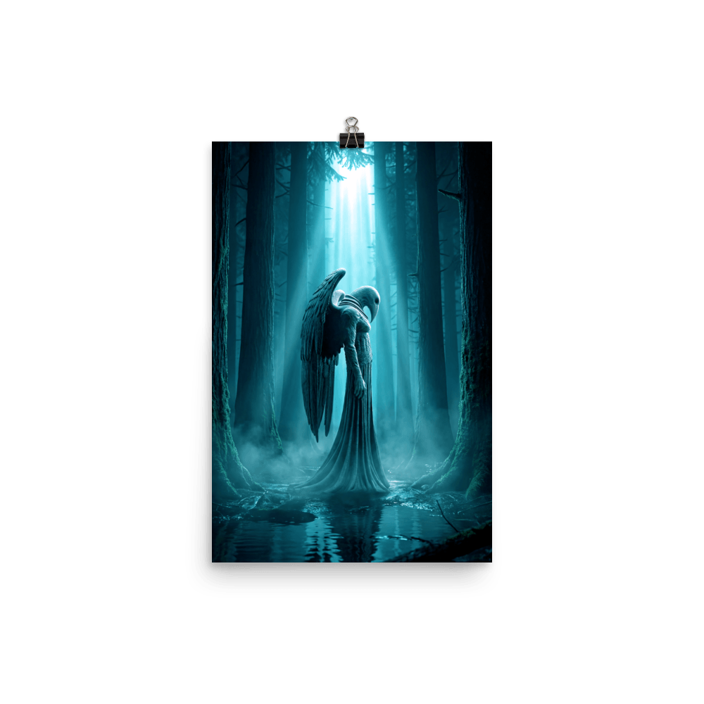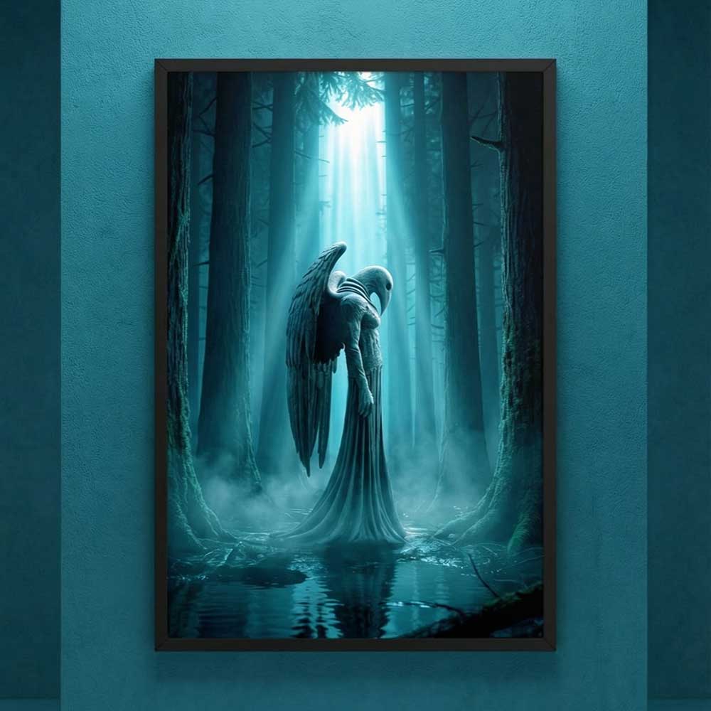 Wings lowered. Form unmoving. The forest holds its breath as water gathers at the threshold. This image belongs to The Watchers current within Chapter VIII — entities positioned between passage and pause. They do not intervene. They remain. Fixed in place, the portal does not open forward, but inward.
